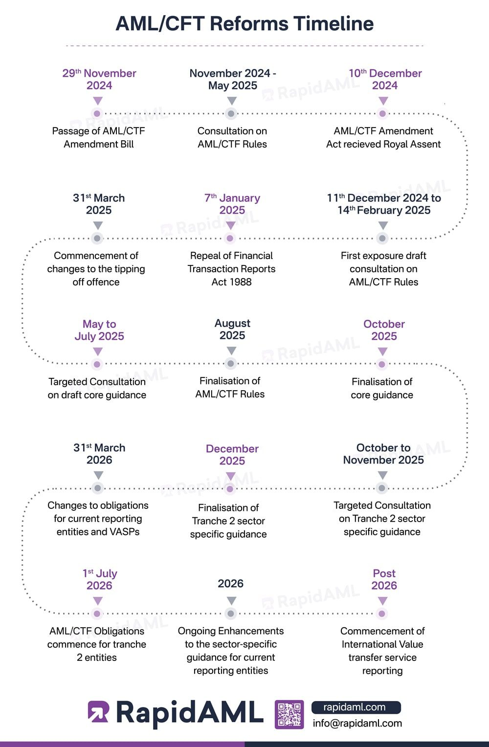 This infographic explains how Australia’s AML/CTF reforms have taken shape. From when the law was passed in 2024 to what’s coming next. It walks you through the key events which occurred and will occur under the reforms concerning the AML/CTF Amendment Act 2024 (Amendment Act). It focuses on AML/CTF Amendment Act 2024 and the Tranche 2 Timeline, which businesses Australia’s Anti Money Laundering framework has entered a new phase. With the Amendment Act in effect, several key events now shape how Tranche 2 entities will need to adjust and be prepared accordingly.