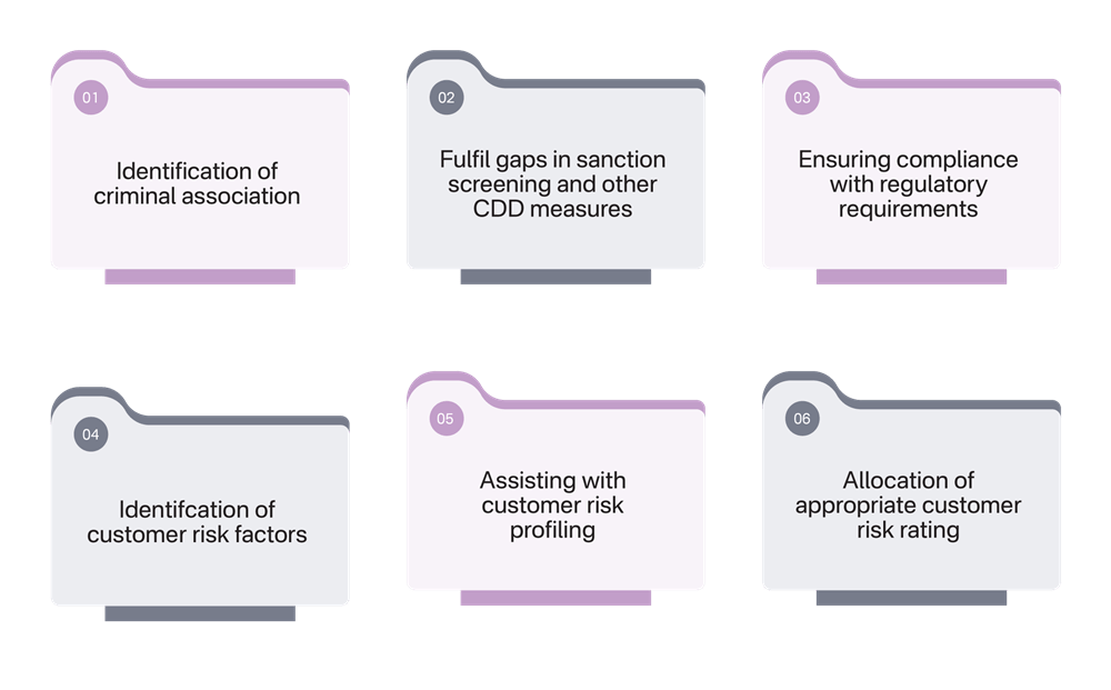 In UAE’s real estate sector, name screening helps the Customer Due Diligence (CDD) process by detecting risks tied to individuals or entities involved in property transactions. When aligned with business-specific risk factors and supported by accurate results, name screening significantly enhances the integrity of CDD.